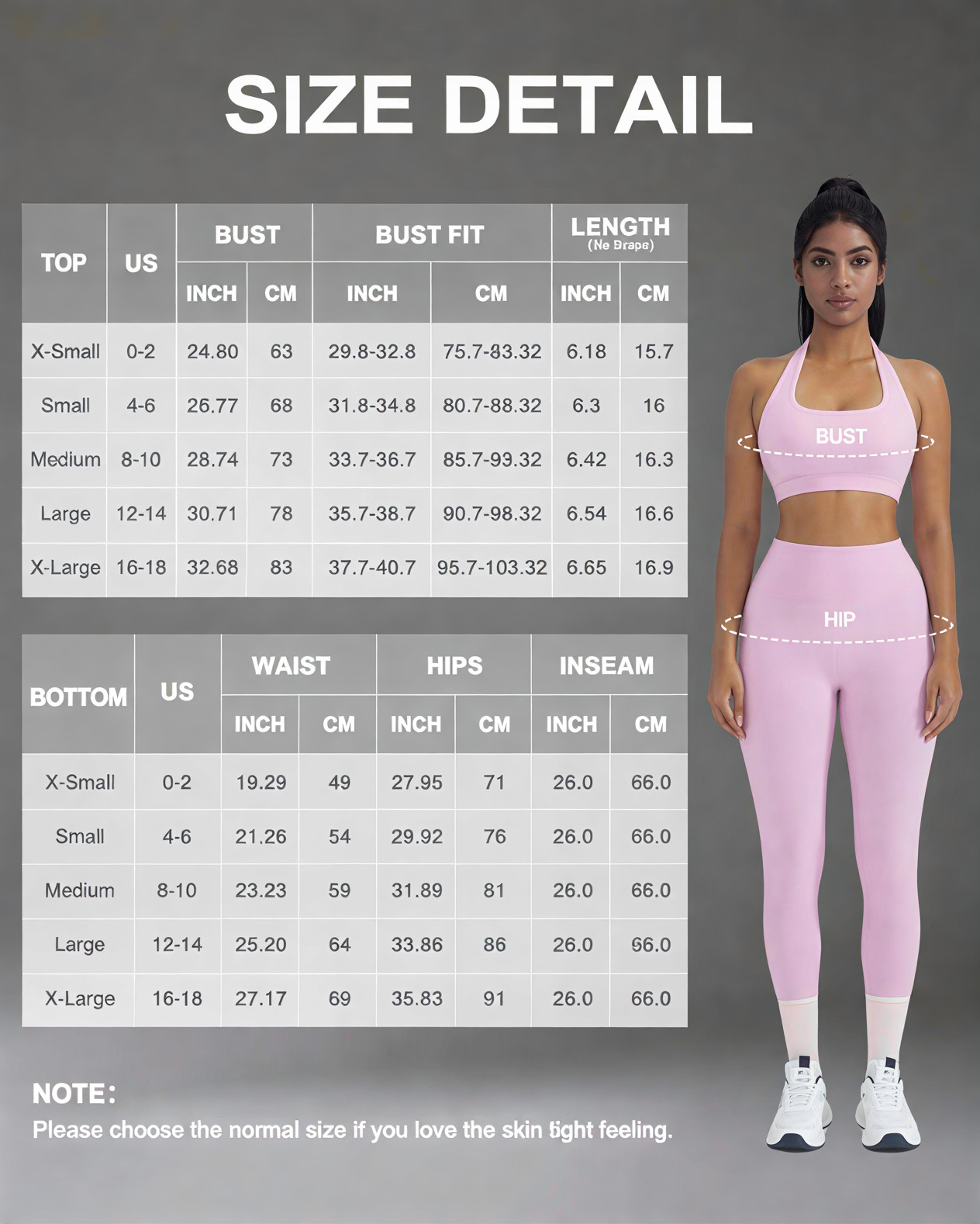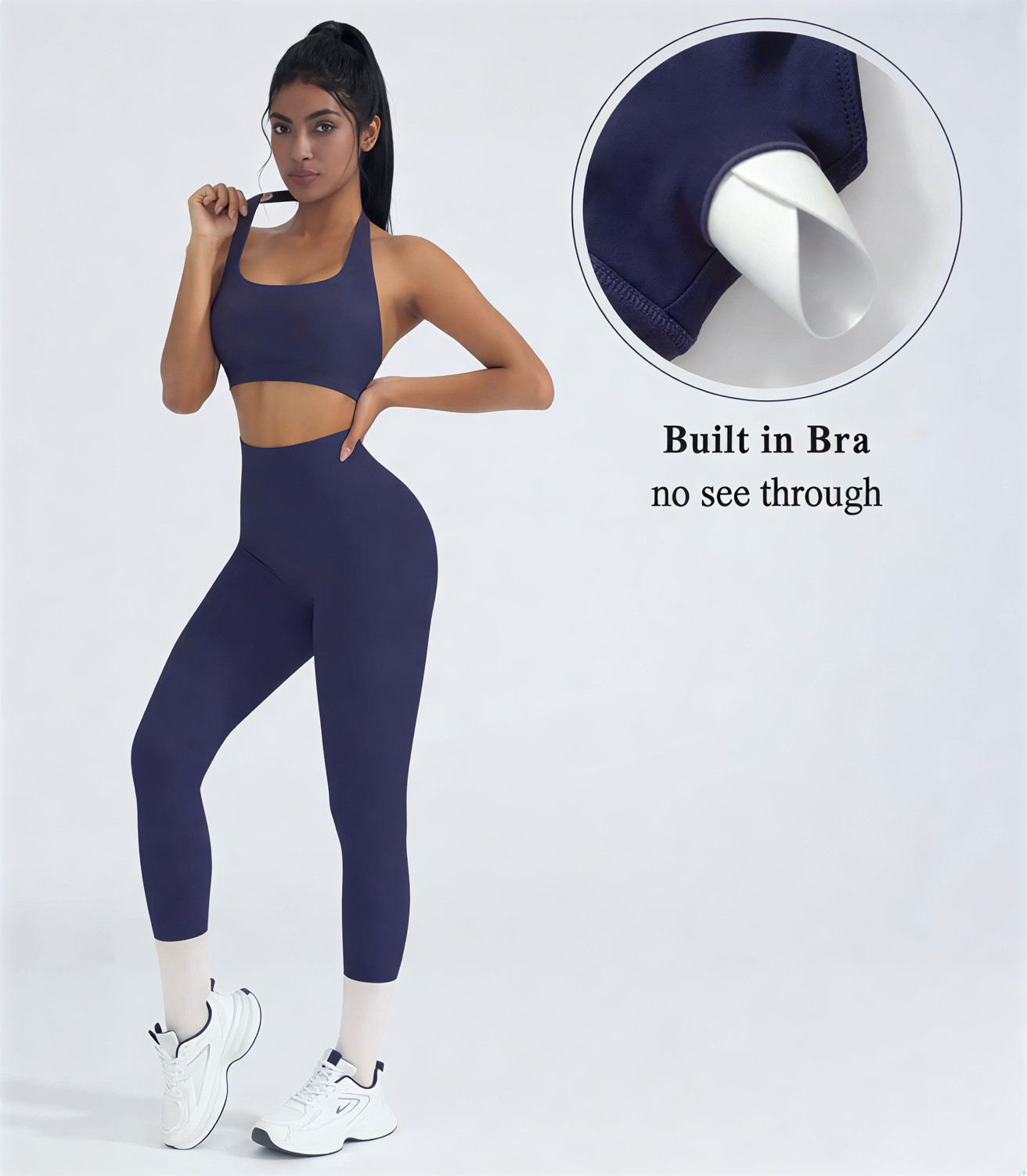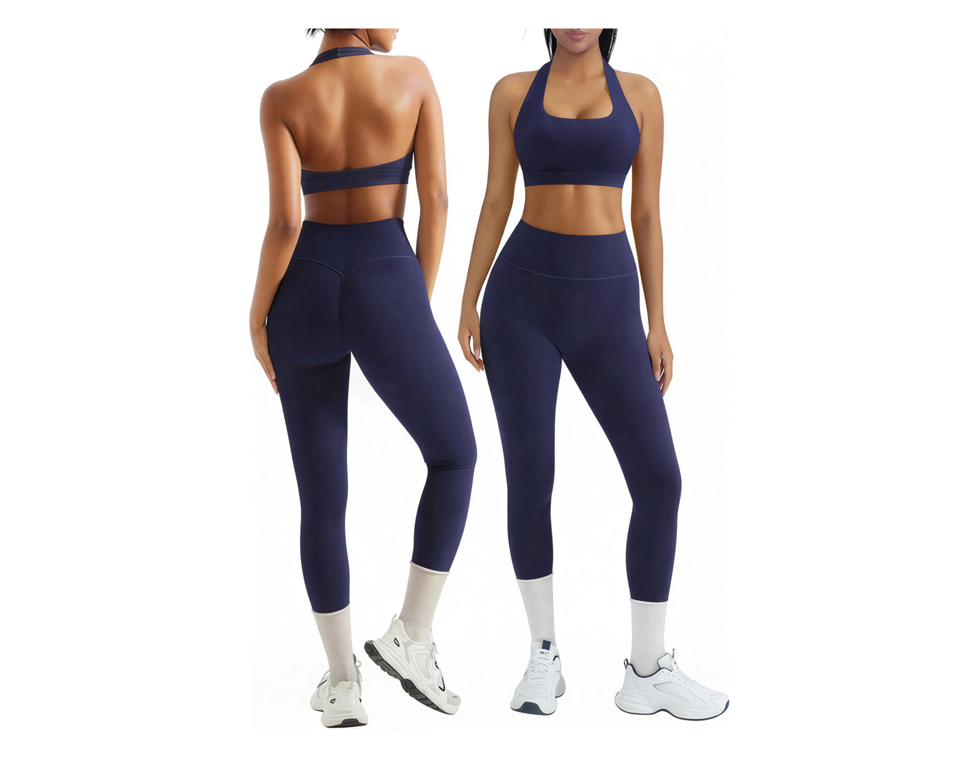 True-to-Size Fit: Small = US 2-4, Medium = US 4-6, Large = US 6-8, X-Large = US 8-10. Halter-neck bra paired with tummy-control leggings for a slimming, stylish activewear look.