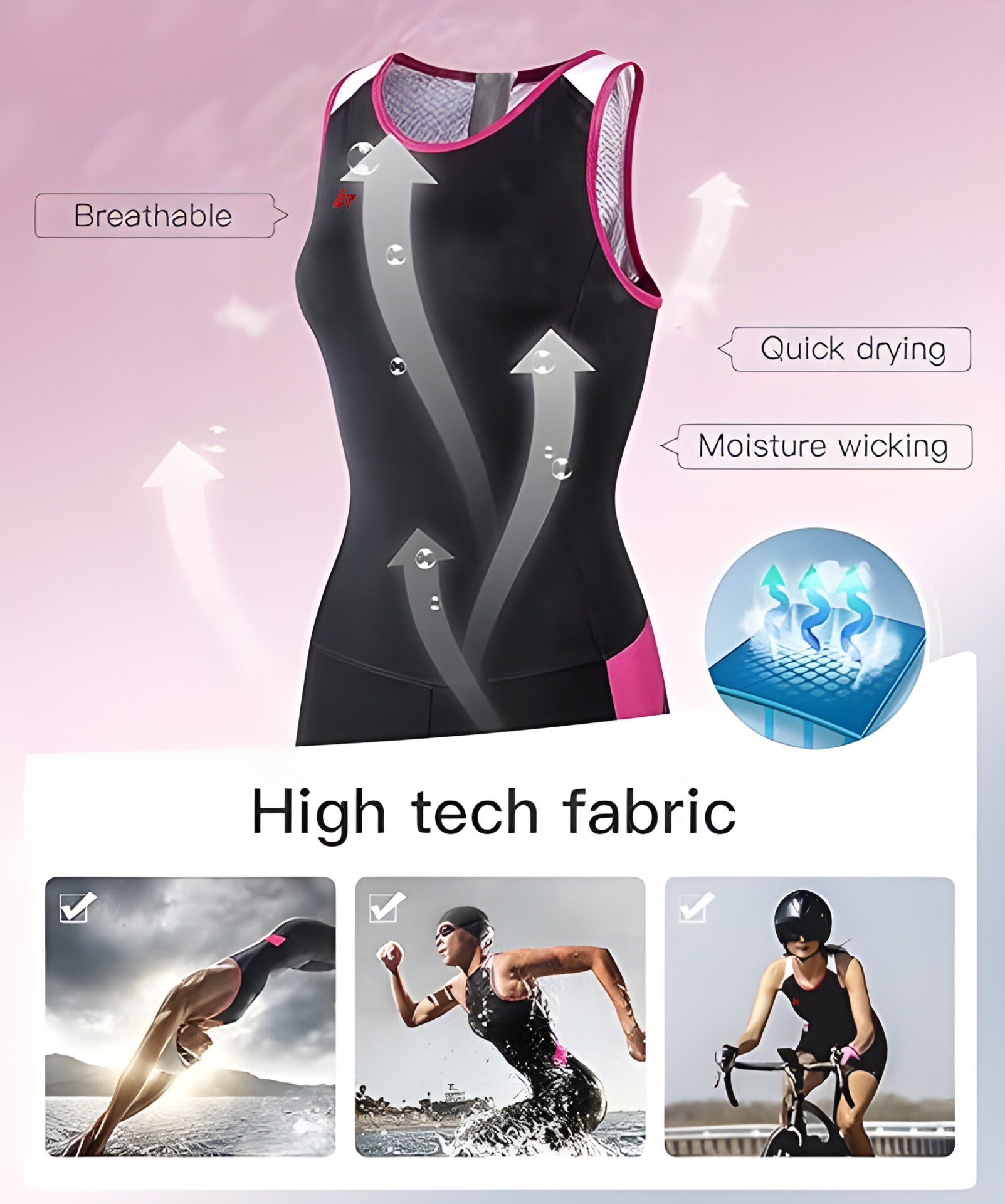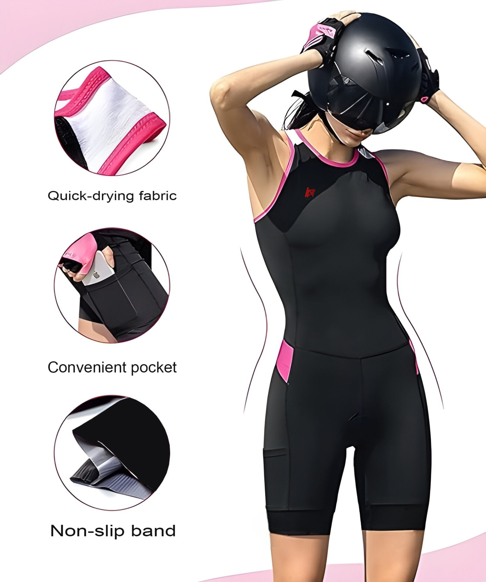 AR Sports Women’s 3-in-1 Sports Suit – Sleeveless one-piece with padded chafe-free support, quick-dry fabric, and slimming design. Perfect for running, swimming, and cycling with elastic stretch, non-slip leg bands, back zipper with pull rope, and mesh side pockets for keys or energy gels. Ideal for training, racing, and active performance.